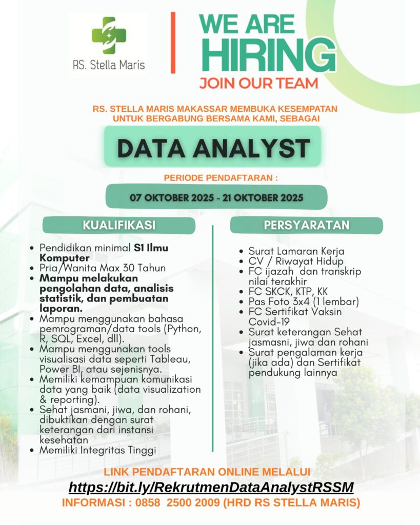 Okt 06 0 Recruitment Data Analyst Posted by rsstella in Berita, Informasi, Lifestyle OPEN RECRUITMENT Hai Sahabat Sehat, RS. Stella Maris membuka kesempatan untuk bergabung bersama kami sebagai : Data Analyst Keterangan kualifikasi dan persyaratan tertera pada gambar. Informasi lebih lanjut dapat menghubungi : 085825552009 Periode pendaftaran : (07 Oktober 2025 – 21 Oktober 2025) Link pendaftaran online : https://bit.ly/RekrutmenDataAnalystRSSM – Berkas yang lebih awal masuk akan kami proses terlebih dahulu – Link akses lamaran dapat ditutup apabila kuota pelamar telah terpenuhi