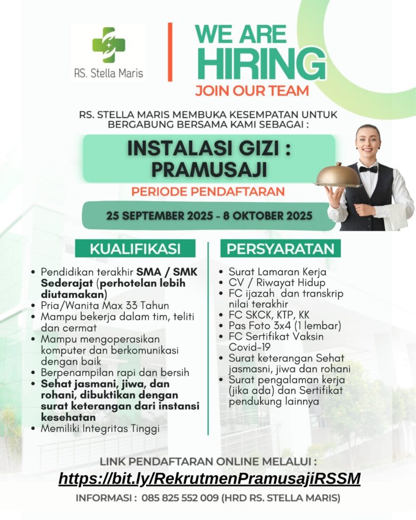Sep 26 0 Recruitment Instalasi Gizi : Pramusaji Posted by rsstella in Berita, Informasi, Lifestyle OPEN RECRUITMENT Hai Sahabat Sehat, RS. Stella Maris membuka kesempatan untuk bergabung bersama kami sebagai : Instalasi Gizi : Pramusaji Keterangan kualifikasi dan persyaratan tertera pada gambar. Informasi lebih lanjut dapat menghubungi : 085825552009 Periode pendaftaran : (25 September 2025 – 08 Oktober 2025) Link pendaftaran online : https://bit.ly/RekrutmenPramusajiRSSM – Berkas yang lebih awal masuk akan kami proses terlebih dahulu – Link akses lamaran dapat ditutup apabila kuota pelamar telah terpenuhi