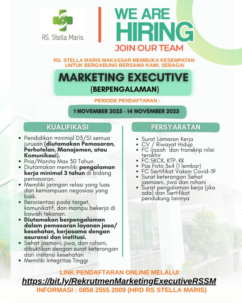 Nov 03 0 RECRUITMENT MARKETING EXECUTIVE Posted by admin admin in Berita, Informasi, Lifestyle OPEN RECRUITMENT Hai Sahabat Sehat, RS. Stella Maris membuka kesempatan untuk bergabung bersama kami sebagai : Marketing Executive Keterangan kualifikasi dan persyaratan tertera pada gambar. Informasi lebih lanjut dapat menghubungi : 085825552009 Periode pendaftaran : (01 November 2025 – 14 November 2025) Link pendaftaran online : https://bit.ly/RekrutmenMarketingExecutiveRSSM – Berkas yang lebih awal masuk akan kami proses terlebih dahulu – Link akses lamaran dapat ditutup apabila kuota pelamar telah terpenuhi