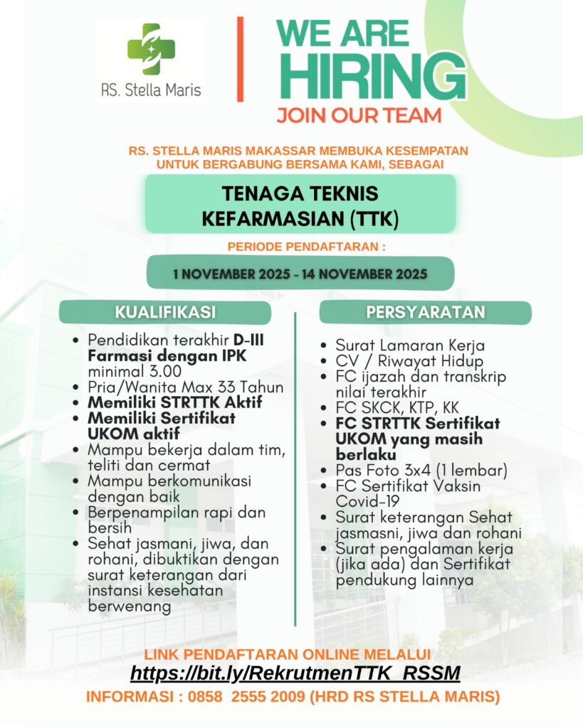 Nov 03 0 Recruitment Tenaga Teknis Kefarmasian (TTK) Posted by admin admin in Berita, Informasi, Lifestyle OPEN RECRUITMENT Hai Sahabat Sehat, RS. Stella Maris membuka kesempatan untuk bergabung bersama kami sebagai : Tenaga Teknis Kefarmasian (TTK) Keterangan kualifikasi dan persyaratan tertera pada gambar. Informasi lebih lanjut dapat menghubungi : 085825552009 Periode pendaftaran : (01 November 2025 – 14 November 2025) Link pendaftaran online : https://bit.ly/RekrutmenTTK_RSSM – Berkas yang lebih awal masuk akan kami proses terlebih dahulu – Link akses lamaran dapat ditutup apabila kuota pelamar telah terpenuhi